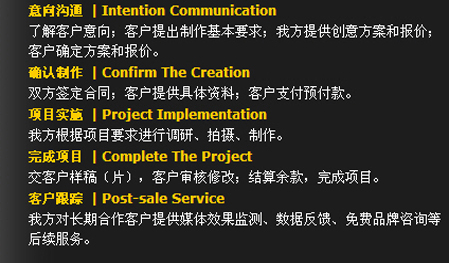 保證力——作業(yè)流程 我們一直相信,只有科學(xué)、規(guī)范的作業(yè)流程作為運作保障,優(yōu)秀的創(chuàng)意才能得以完美的實施。在經(jīng)典影視,我們一直秉承——策略精準(zhǔn) . 創(chuàng)意新銳 . 執(zhí)行出色。
